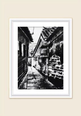 最后,让我们回到田画家的“老北京黑白油画系列”,看一看最能体现她观察现实生活眼光独到的作品《冻坏的家》,与上面列举的经过润色的《玻璃瓶花》不同。这是一幅颇具时代感的佳构,写实的风格达到一种极致,使人被眼前景物的真实以及叙事的坦诚所震撼。严冬的大雪落满城市街巷,那裸露的斑驳墙壁上,刻有岁月中风雨侵蚀过的一道道疤痕,可谓伤痕累累,一种切肤之痛让观者于心不忍,家本该是温暖的所在,无奈季节不对而世事乖戾……田画家类似关注普通人生活、关爱生命、关切人生、写实精确、逼真、感人的作品还有很多,例如《胡同口》、《胡同深处的白塔》、《亲切的小夹道》、《小院咖啡》、《墙角》、《在家吗?》等等。