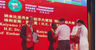 在全场持久的掌声中,邢学坤代表孔子奖章组织委员会向纳米比亚驻华大使伊来亚•乔治•凯亚莫(Kaiyamo Elia George)、 毛里求斯驻华大使王存万(Slain Wong Yen Cheong)颁发了孔子奖章•有朋奖及证书。